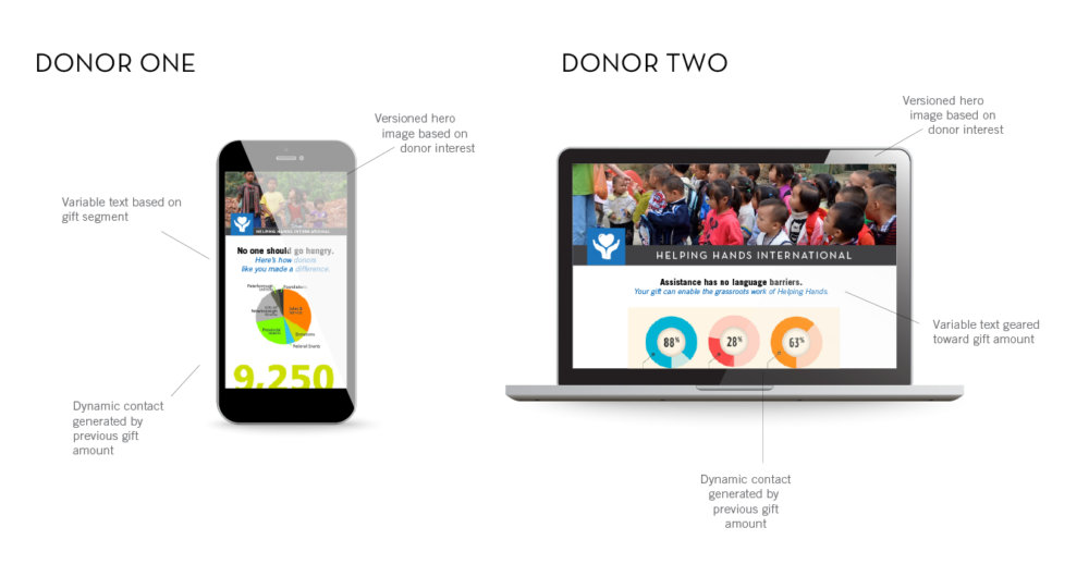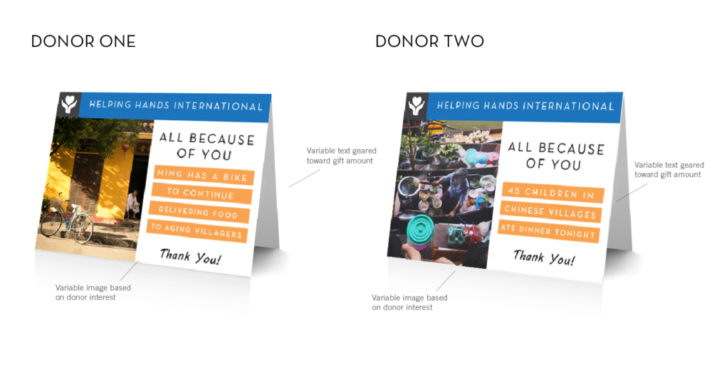 Variable data applies content specially crafted for each recipient, which can be switched out from piece to piece by pulling information from computerized databases. This makes the experience unique for each individual. Addressing the recipient by name, making a reference to the city they live in, and mentions of past giving history or other accomplishments are examples of variable content.
