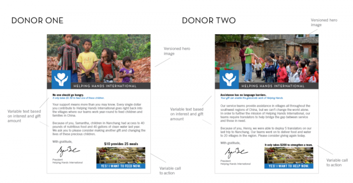 If you have access to your web developer, consider using personalized campaign pages. These pages allow you to version text and images for specific segments of your audience, refer to other materials they have received, and thank them for their previous donations.