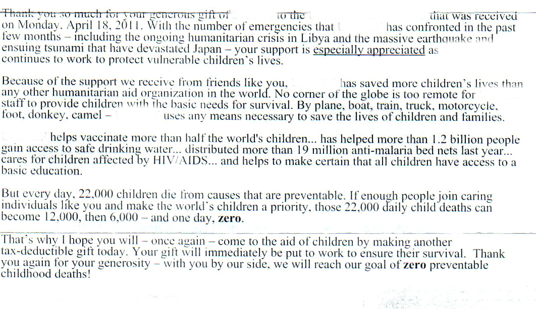 Then there are all the businesslike acknowledgments I get. I pulled some from my “oh dear” file. Like this one. Notice how it鈥檚 all about the organization? I feel like they love me, no, like me only for my money. (But I’m comforted that my support is going to Where It’s Needed Most.)